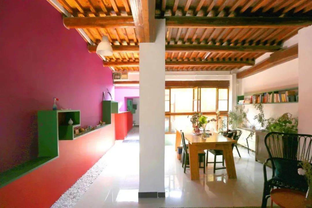 隔壁原来也是破破烂烂,但因为她自己是建筑师,就自己花了6万块钱做了改造。她喜欢热烈的氛围,把墙面涂了大红大紫,一些隔墙拆掉,加建了一个玻璃砖做的卫生间。以前灰扑扑的老房子弄完后焕然一新。房东连连感慨说是“翻天覆地的变化”。
