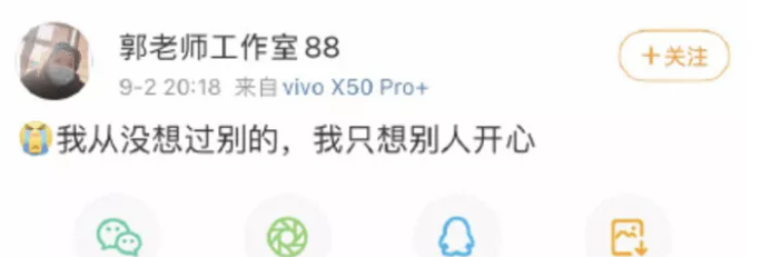 当晚8点,郭老师在小号回应称:“我从没想过别的,我只想别人开心”。