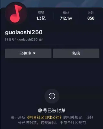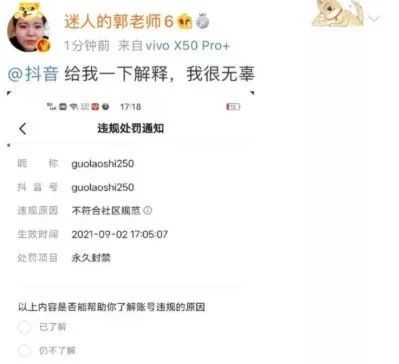 9月2日,郭老师的短视频账号“迷人的郭老师”被抖音封禁。