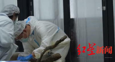 考古发掘人员在现场小心处理刚提取出来的神树残件