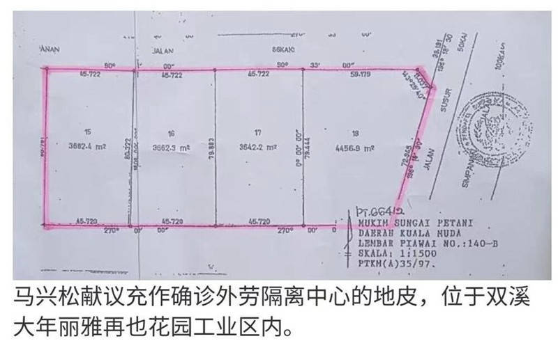 9月6日,马兴松先生以房地产为核心业务的挂牌公司优宾机构(EUPE)创办人的身份在优宾饮食中心28房间举行新闻发布会,并正式提出兴建外劳隔离中心的计划。据悉,这片由4个地段连接在一起的地皮共1.544英亩(6248.35平方米),位于吉打州双溪大年的丽雅再也花园工业区内,是优宾集团开发的一个小型工业区。该地段除了基本设施以外,还有大片空地供病人晒太阳以及各种休闲活动,是一个极佳的疗养之地。