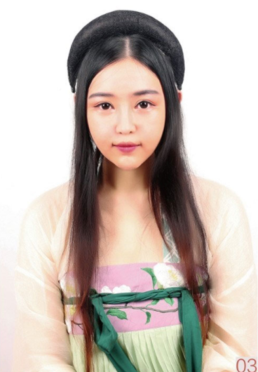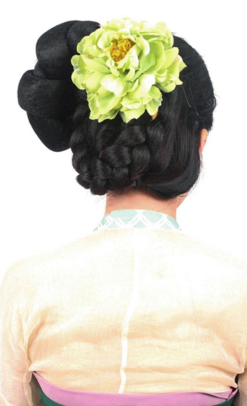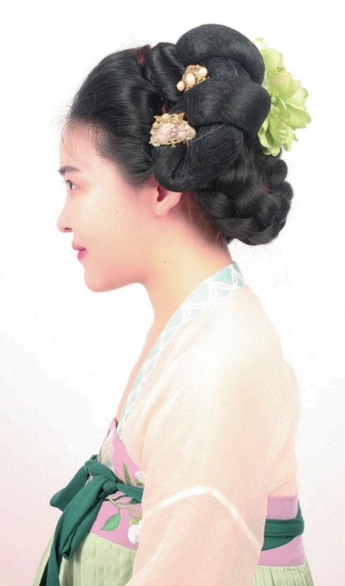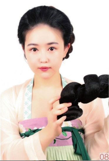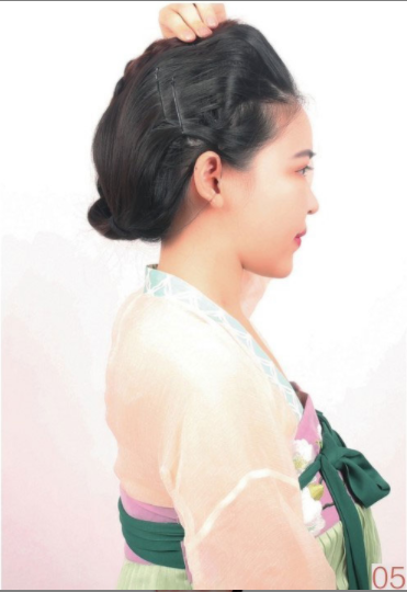 【所用手法】垫发,编发,使用假发髻。
