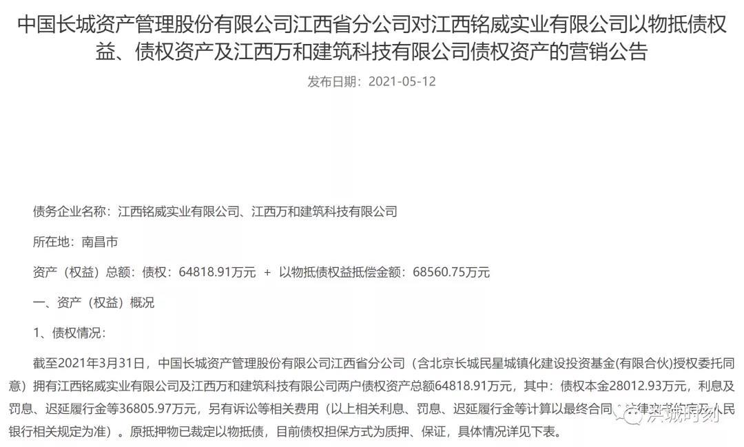 在今年5月,该公司也发布了对江西铭威实业有限公司以物抵债权益、债权资产及江西万和建筑科技有限公司债权资产的营销公告,拟寻求投资人接盘。