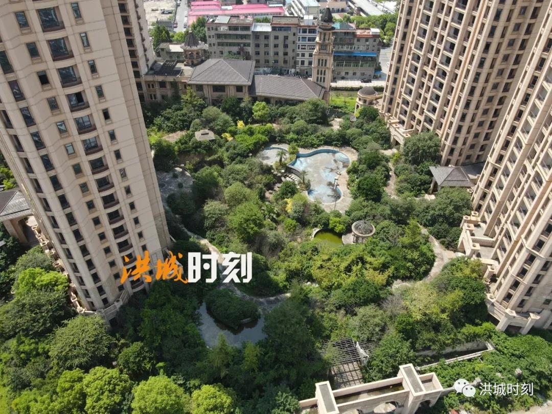 走进项目看,小区内部的园林景观已经生长为“森林公园”,郁郁葱葱,内部的泳池积满了灰尘。