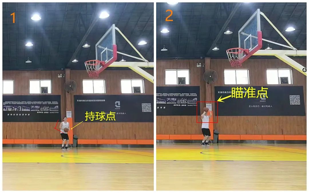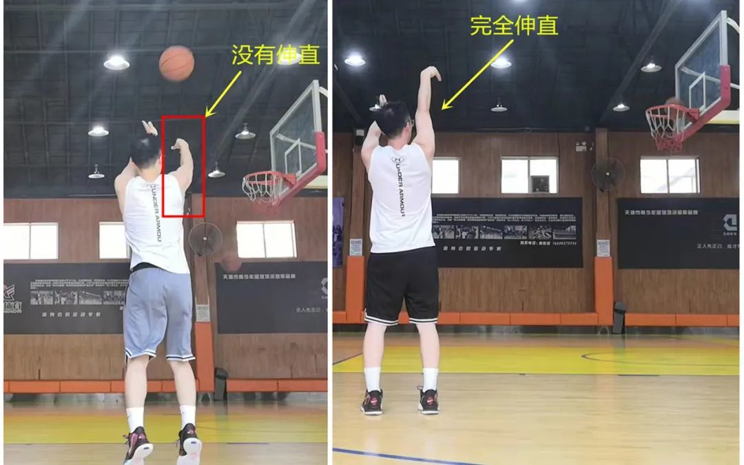 从图中你也会发现:右手打直后,整个手臂是向上的,所以球是向上飞行,此时弧度会提升很多。而修正前,很明显,手臂更多的是向前的方向。而球在空中的弧度,是决定我们投篮命中率最重要的因素。
