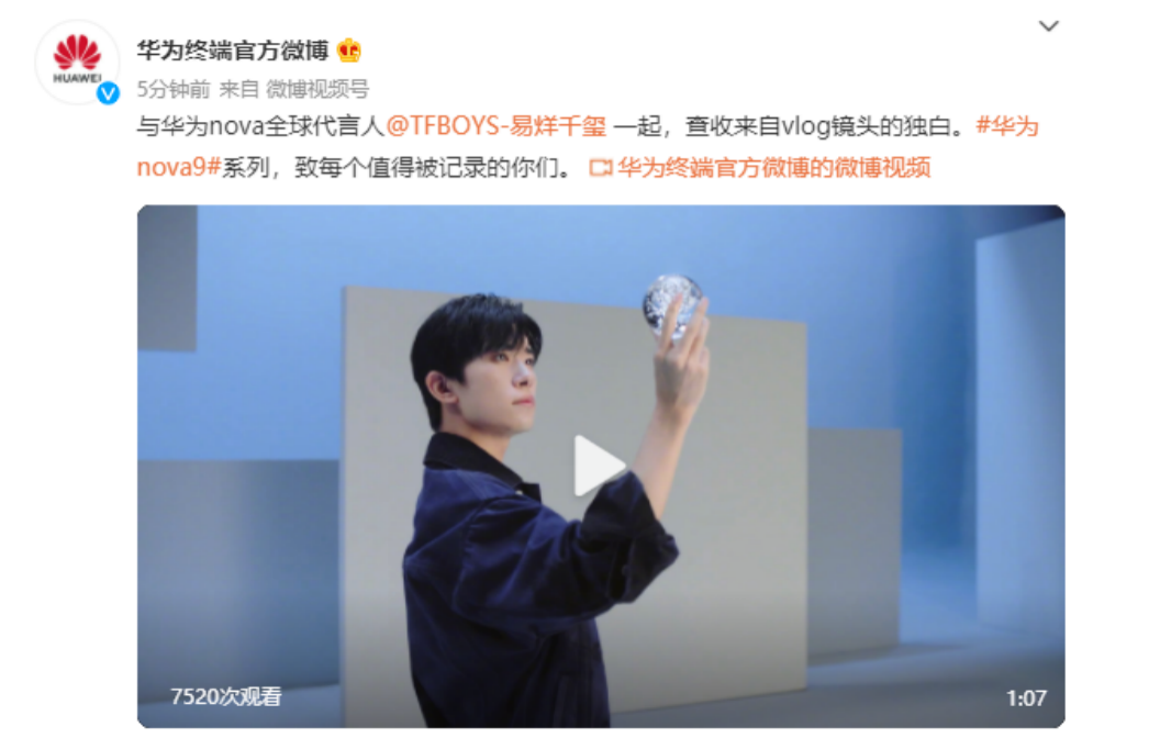 华为官方微博发布了预热海报,官宣nova系列最新产品——华为nova9即将在9月23日正式发布。从海报图中来看,华为nova9,通过易烊千玺的展示简直就像一件艺术品一样,具备潮流之风。从外观设计可以看出,nova产品基因,是一款潮流设计、注重年轻消费群体打造的潮流单品。
