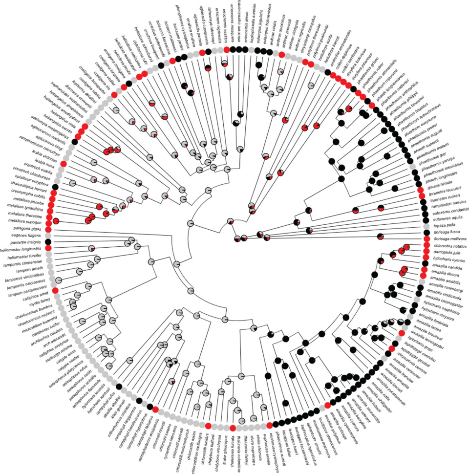 300种蜂鸟的演化树。红色为有女扮男装的蜂鸟物种,黑色为雌雄的外貌并无分别的物种 | [2]