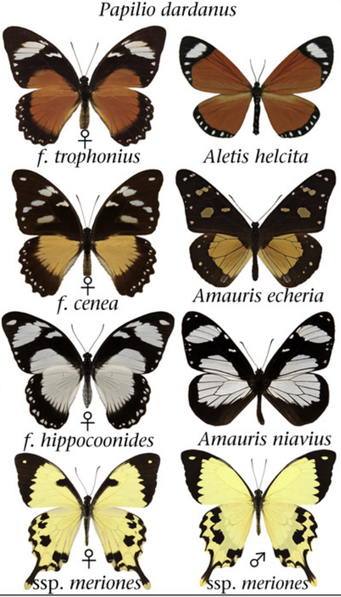 非洲白凤蝶。左列为同种蝴蝶雌性的不同形态,右列为她们分别所拟态各种有毒蝴蝶(上一至三)和本种的雄性(最下)| [6]