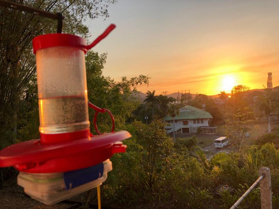 蜂鸟喂食器。在美洲,很多人会在自家院子里放一个蜂鸟喂食器,吸引蜂鸟来吸食里面的糖水,从而得以观赏蜂鸟美妙的飞行姿态。图片中的蜂鸟喂食器,研究人员在上面加了一个可以识别芯片的装置,这样就可以记录有哪些被标记的蜂鸟来访过了,每次来了多久 | Credit: Jay Falk, CC BY-NC-SA