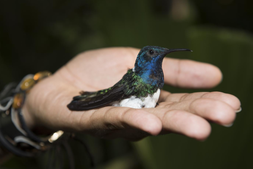 一只雄性蜂鸟样子的雌性白颈蜂鸟。研究人员做好标记后,准备将其放回野外