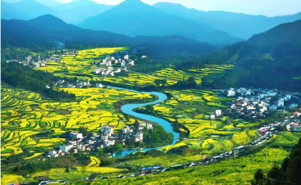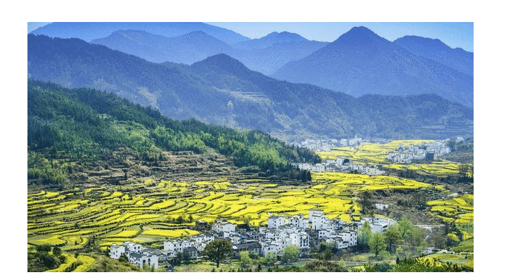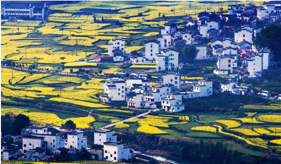 三月阳春,更是油菜满山遍野,如诗如画的季节,选择在较高的山坡对古村庄进行拍摄,让以白色为主色的徽居镶嵌于漫山遍野嫩黄色油菜花海中,整体景色协调而静雅,这样的视角是拍摄油菜花最常见也最出彩的视角。