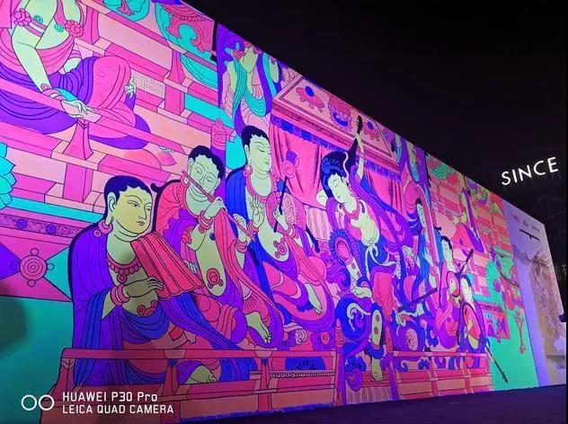 京东与华为携手敦煌博物馆官方IP授权机构·鲜活万物,在保护敦煌艺术作品的同时,融入了现代元素进行二次创作。京东与华为更是别出心裁地用现代年轻人喜爱的方式,采用荧光涂料来再创作飞天艺术作品。画家们使用的绘画材料为特殊材质,在夜色中呈现出微弱荧光,再现幻夜敦煌。