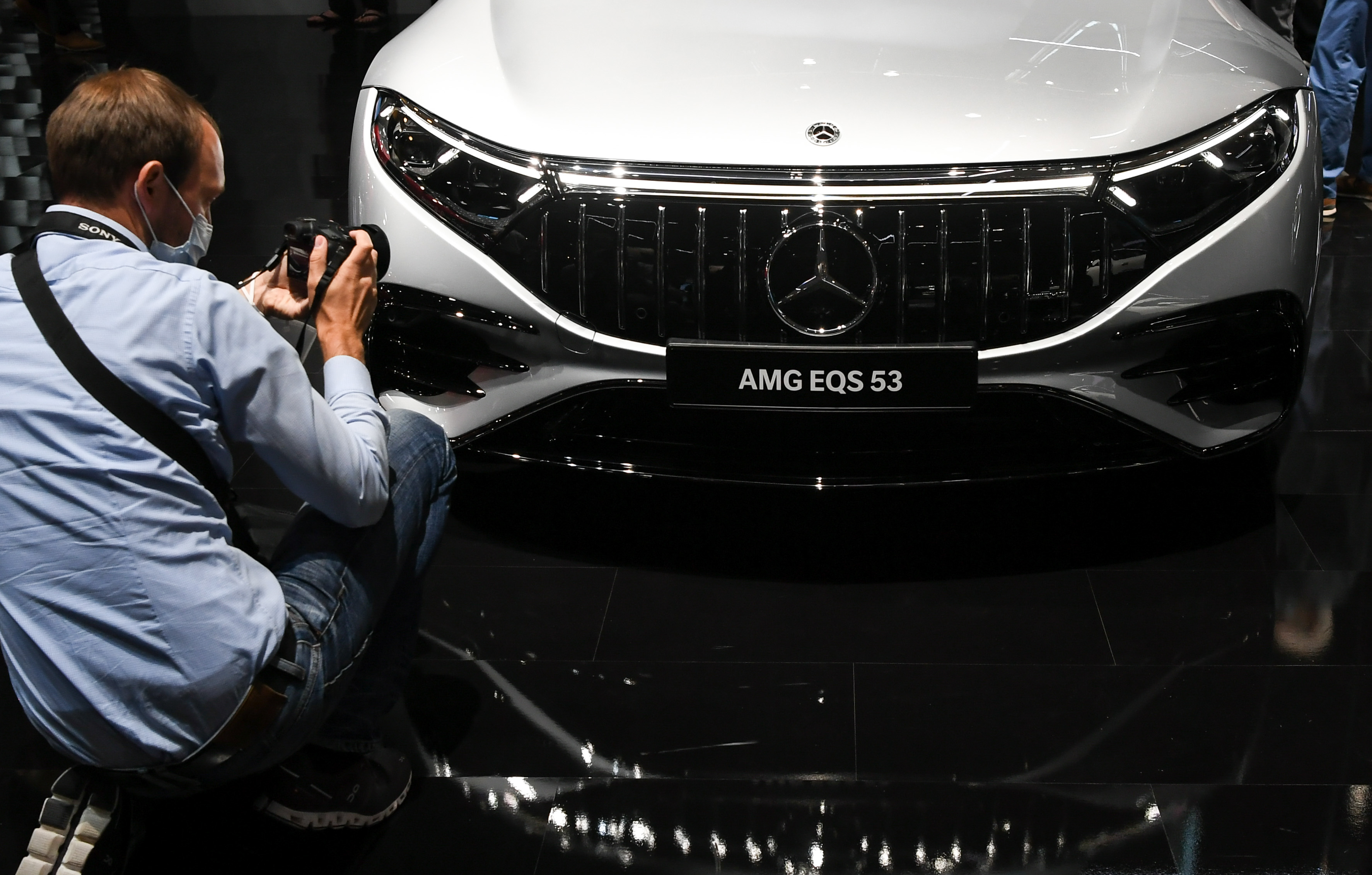9月6日,在德国慕尼黑举办的德国国际汽车及智慧出行博览会媒体日期间,一名男子拍摄梅赛德斯-奔驰AMG EQS 53汽车。新华社记者 逯阳 摄