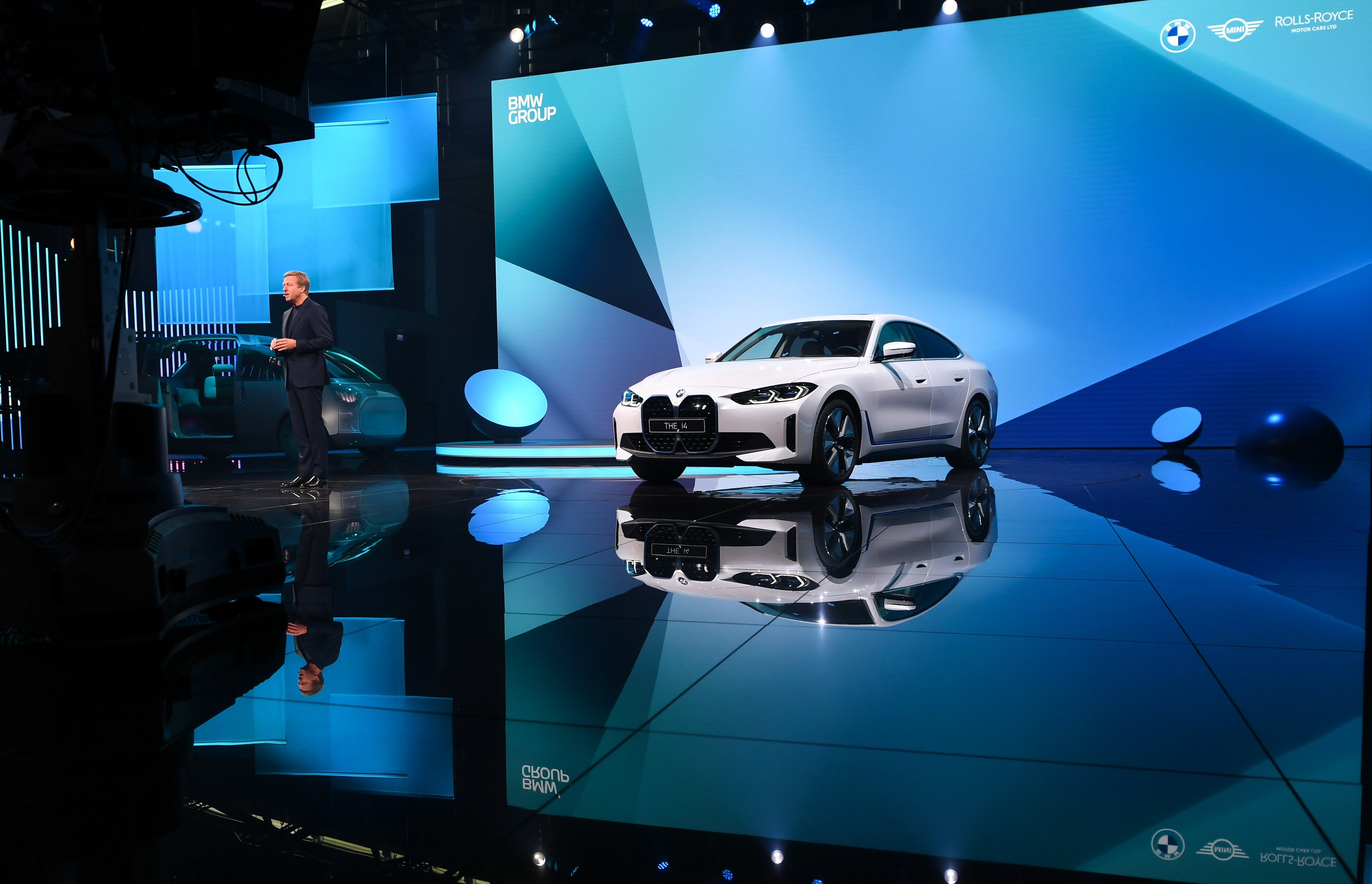 这是9月6日在德国慕尼黑举办的德国国际汽车及智慧出行博览会媒体日期间拍摄的宝马i4汽车。新华社记者 逯阳 摄