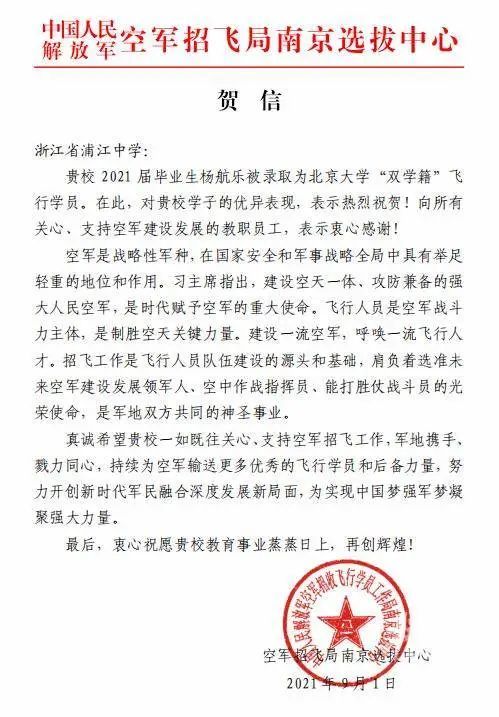 记者从浦江中学获悉,日前空军招飞局南京选拔中心发来贺信,祝贺该校毕业生杨航乐通过选拔,被录取为北京大学“双学籍”飞行学员。