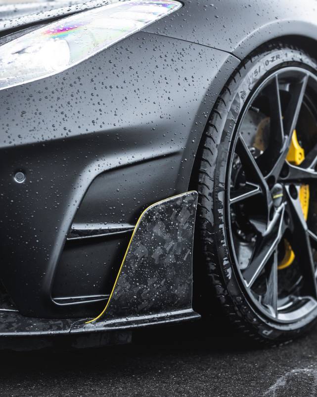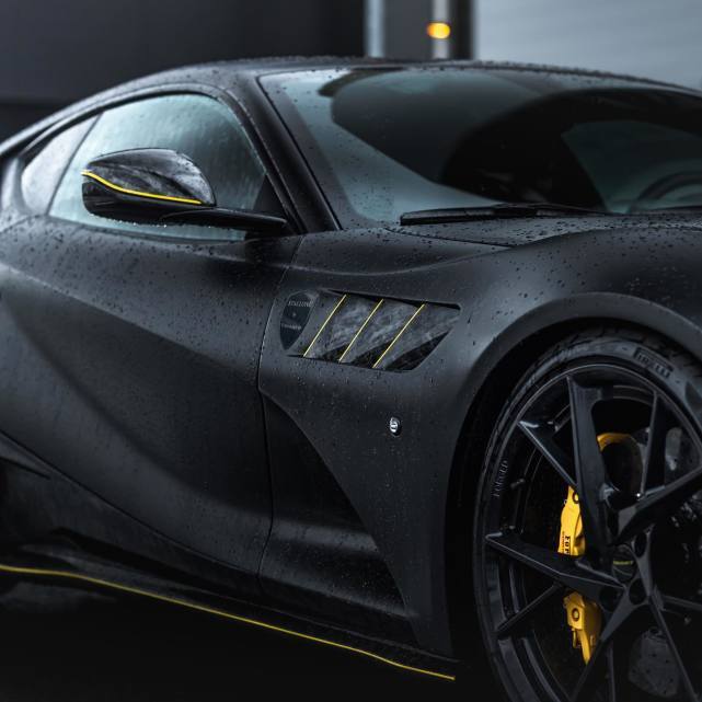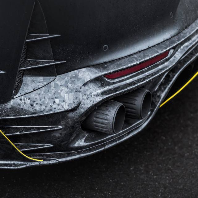 黑色MANSORY迈莎锐Stallone,其前唇、前保险杠、小翼、出风口格栅、前翼子板、侧裙板、侧面板、后视镜罩等,均采用MANSORY自家生产的高工艺锻造花碳打造;并采用亮黄色装饰线进行描边,再加上醒目的黄色卡钳点缀,于沉稳的暗黑系中透出一丝活泼之气。
