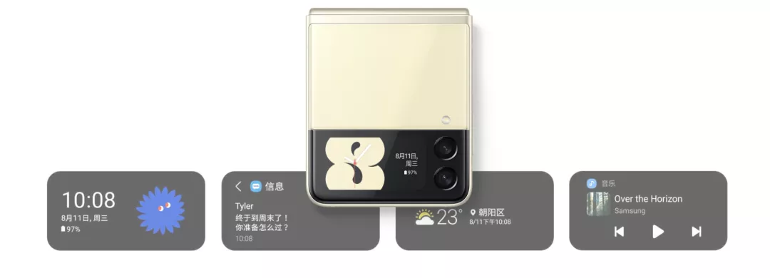 同时,其智能灵动外屏升级为1.9英寸,支持外屏快拍功能,双击电源键即可开启相机;还可通过自定义选项将外屏与三星Galaxy Watch4系列智能手表等设备搭配。