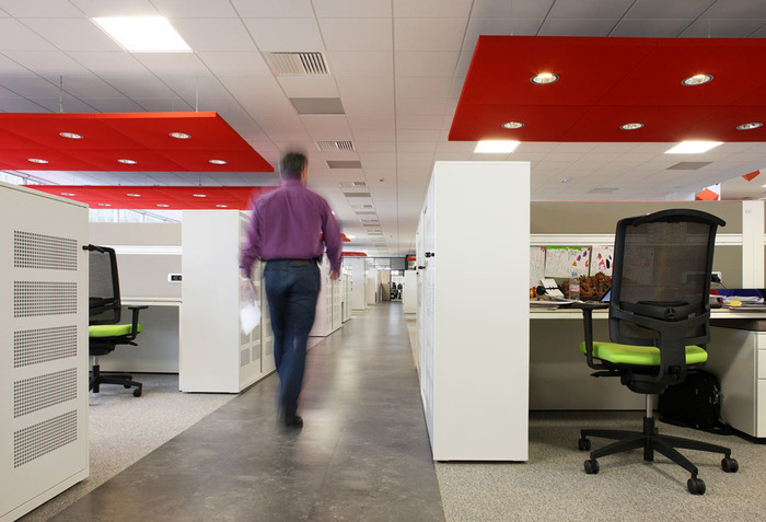 如果办公场地较小,不能施行以上两种办法,只能开放办公的话,为避免室内声音过于嘈杂,可以将设计重点放在办公空间的降噪处理上,其中比较常见的方法就是顶棚采用降噪板,地面铺设厚地毯,办公空间内尽量使用能够降低噪音的办公家具,多管齐下,可以在一定程度上为员工创造一个相对安静的办公空间。