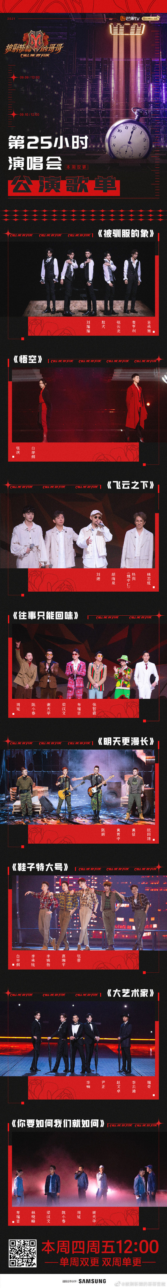 新京报讯 9月8日,芒果TV《披荆斩棘的哥哥》发布了第二次公演歌单。第二次公演名为“第25小时”演唱会,将于本周四、周五12:00上线。