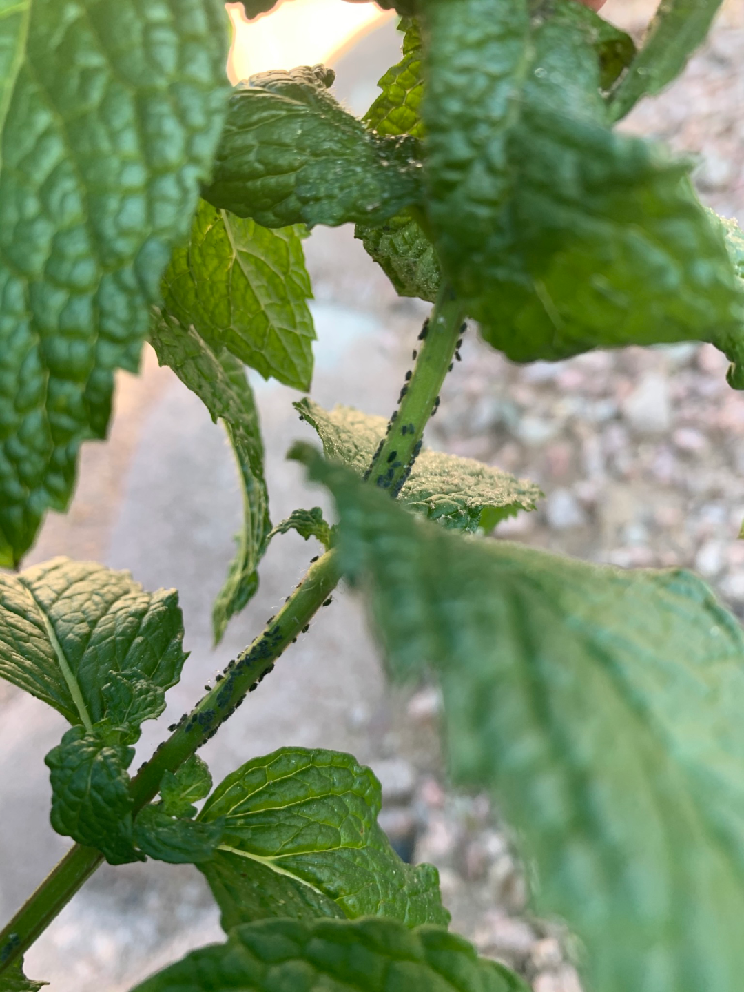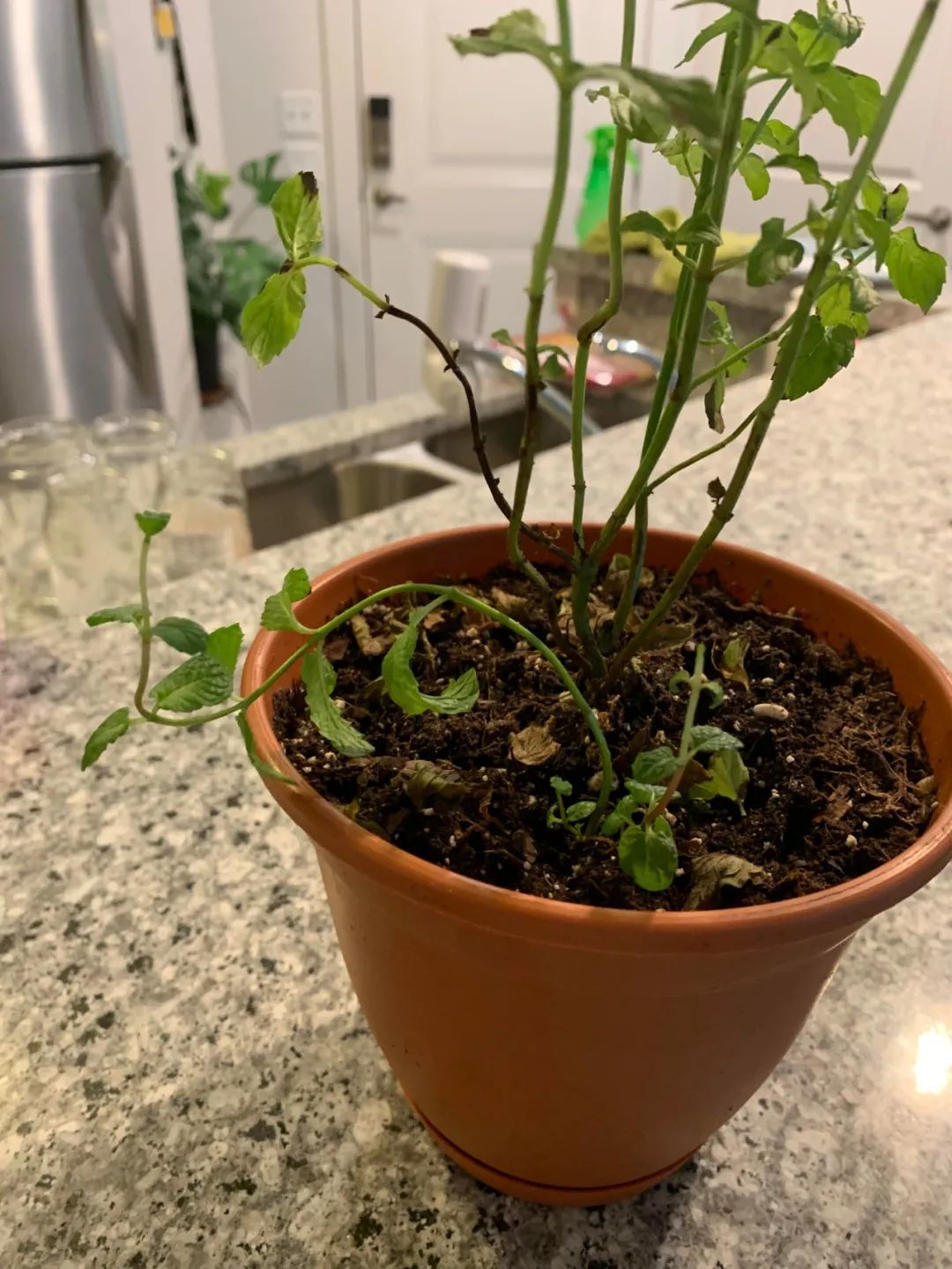 薄荷盆栽底部有枯叶枯枝一定要及时清除干净(并检查是否有病虫害),否则会变成滋生病虫害的温床,特别是在雨水季节,或没有光照的环境下,又或者是通风不佳,都很容易滋生病虫害。