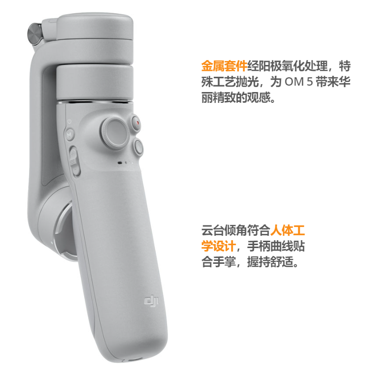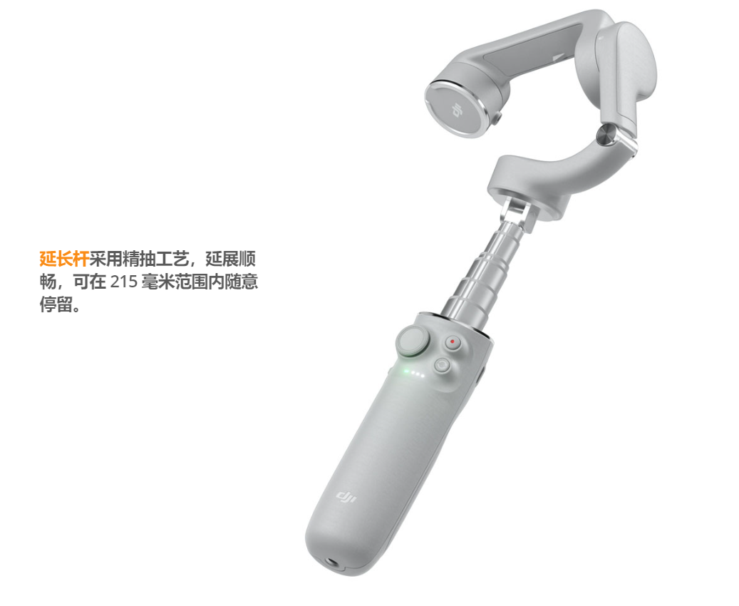 大疆 DJI OM 5 手机云台采用了升级版高精度无刷电机体,体积更小,但是扭矩依旧足够大,可以轻松控制大重量负载。产品搭载新一代控制算法,可以根据云台姿态进行实时补偿,有效控制画面抖动,同时支持在延长杆拉伸状态下,实现增稳效果。