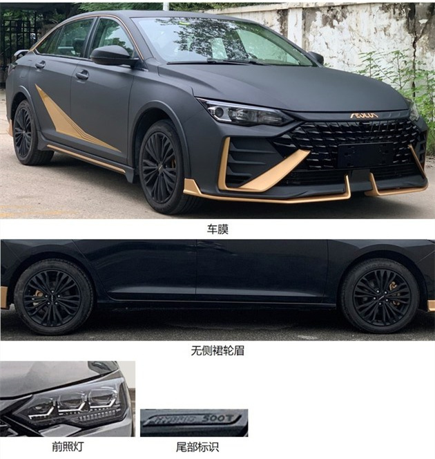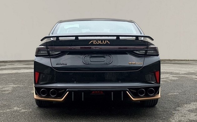 尾部可以明显看到加装了一个尺寸夸张黑色尾翼,看上去非常的酷炫。同时在后包围处也加入了金色元素点缀,内置双边共四出排气,预示着该车强大的性能。