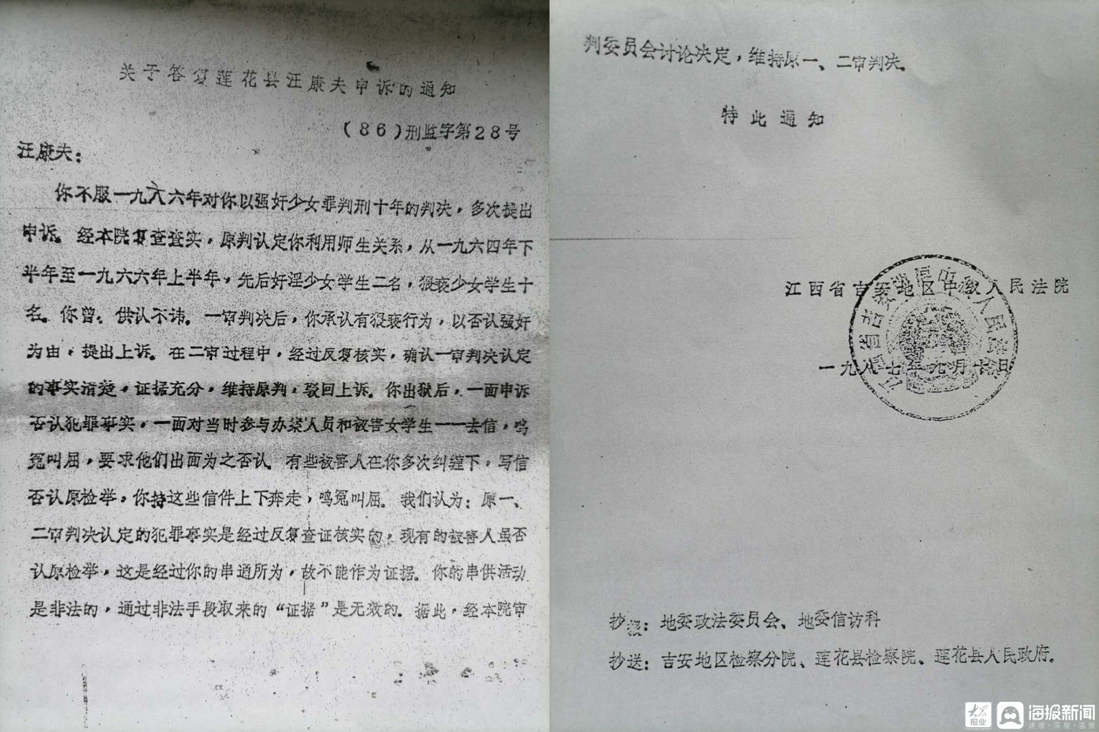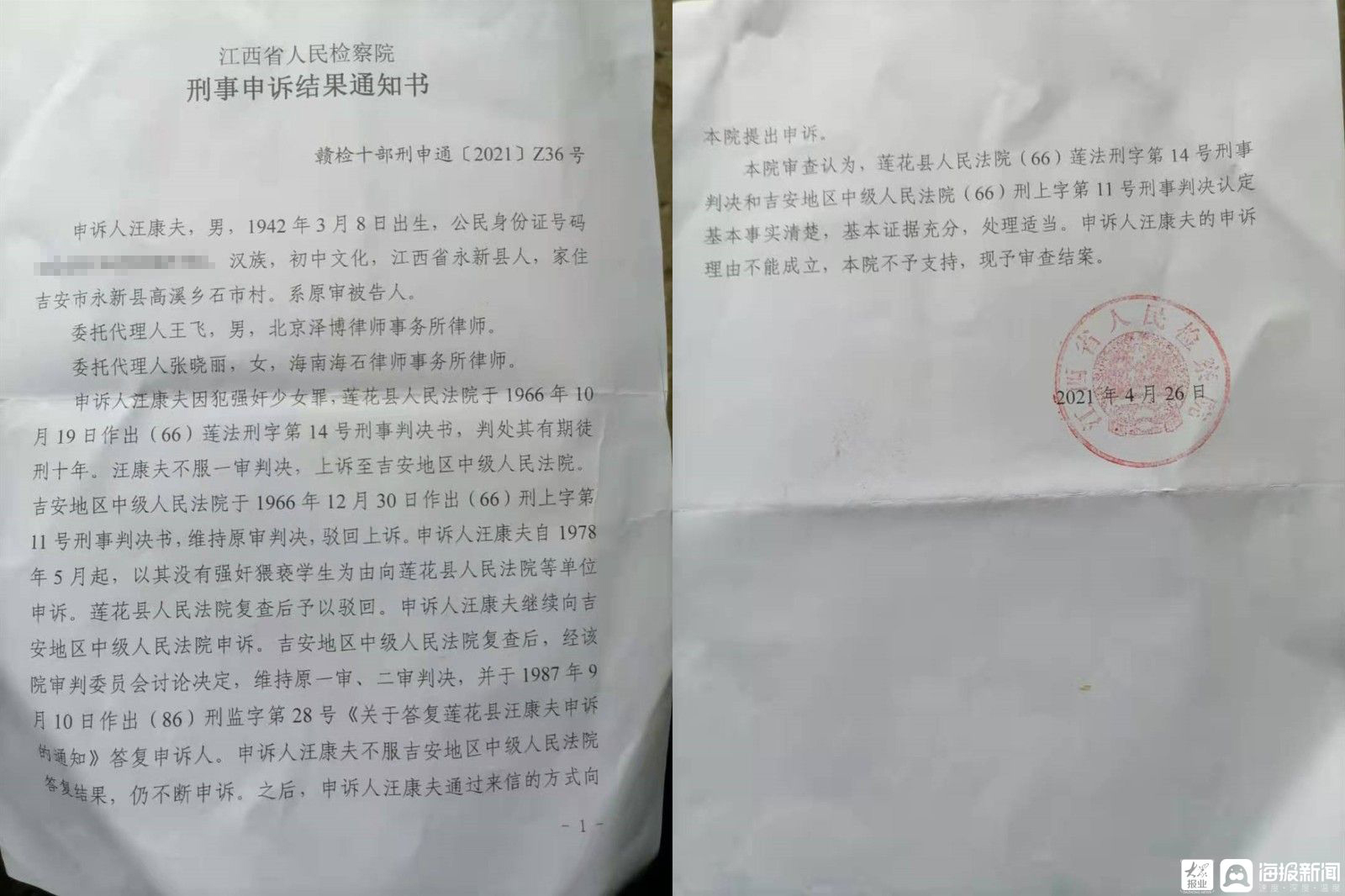 汪康夫今年79年,他曾是江西省莲花县琴水小学的一名教师,1966年,被法院认定为强奸两名女学生、猥亵十名女学生,判处有期徒刑10年。但他坚称无罪,持续申诉至今。8月10日,其收到最高人民检察院短信称已收到他关于刑事申诉的材料,需补充申诉材料。