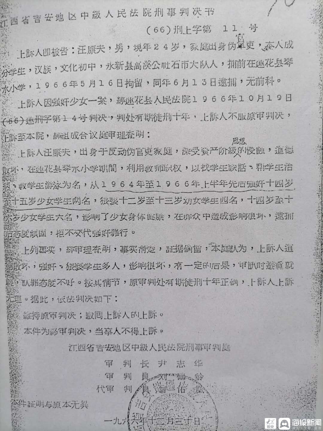 一审后,汪康夫上诉,1966年12月,二审维持原判,汪康夫被判有期徒刑10年。