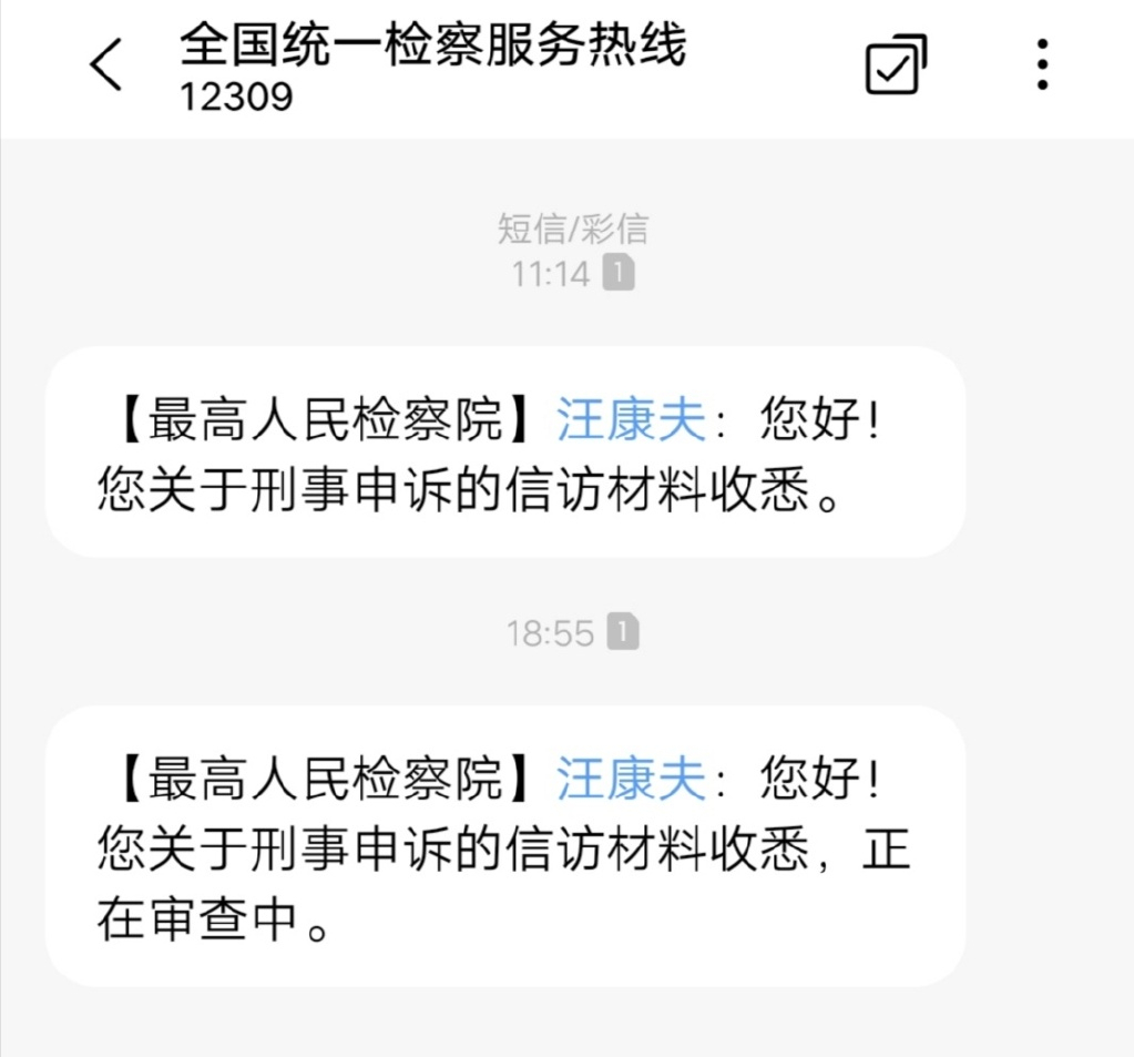 汪康夫说,收到短信第二天,他就补充了材料。目前,汪康夫已再次收到最高检短信,“您关于刑事申诉的信访材料收悉,正在审查中。”