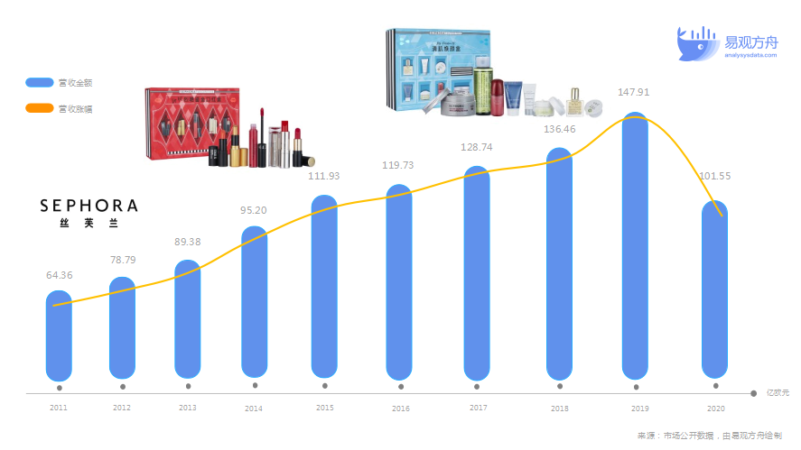 下面,一起来看一下丝芙兰品牌全球营收情况(注:LVMH财报不单独披露丝芙兰品牌营收情况,因此数据主要来自丝芙兰所在精品零售部门的营收情况,仅供参考)。2017 年至 2019 年间,丝芙兰的收入达到 60 亿美元,与5年前40亿美元收入相比增长了近 50%。