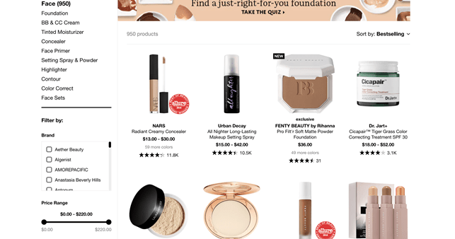 快速查看功能:只需单击一下,购物者就可以查看产品图片并发现有关特定商品的基本信息。丝芙兰还设计了一个调色板,并通过用 X 标记来突出显示哪些色调没有库存。
