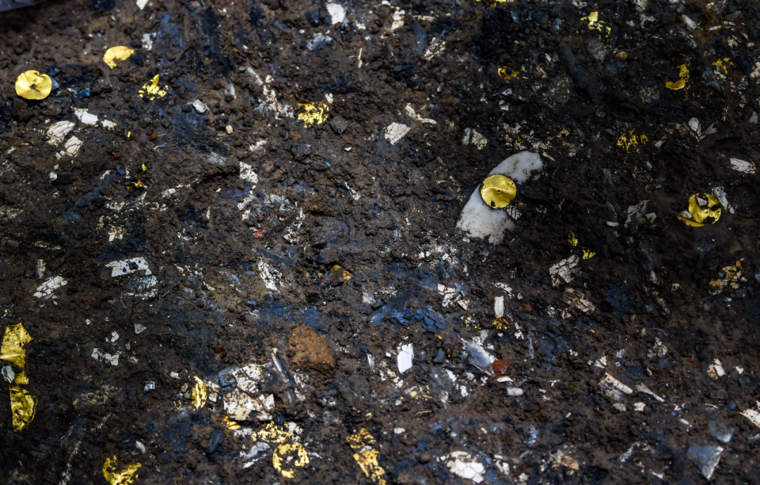 除了金珠,5号坑还分布着大量中间带孔的金圆片,其分布方式有一定规律,专家推测其可能是有意识摆放或是原本附着在某种织物上再铺于坑内。此外,与其他坑整根掩埋的象牙不同,5号坑的象牙器经过精心雕琢,部分纹饰线条比发丝还细,技艺精巧。