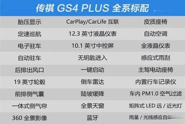 或许在这个时候,大家会说我光讲顶配一些“花里胡哨”的配置,那么对于这款车型的全系标配,整体都有哪些配置呢?面对这个问题,我现在就可以回答你,传祺GS4 PLUS全系标配了定速巡航、19寸大轮毂、一键启动、内置行车记录仪、一体式侧气帘、360全景影像、垫子驻车、10.1寸的中控屏幕、12.3寸的液晶仪表盘等等,至于在这个价位里面,其它车型需要中配才能买到的配置,在这款新SUV里面我们标配就能看见了,说实话,这车较比传祺GS4已经做出了全方位升级了。