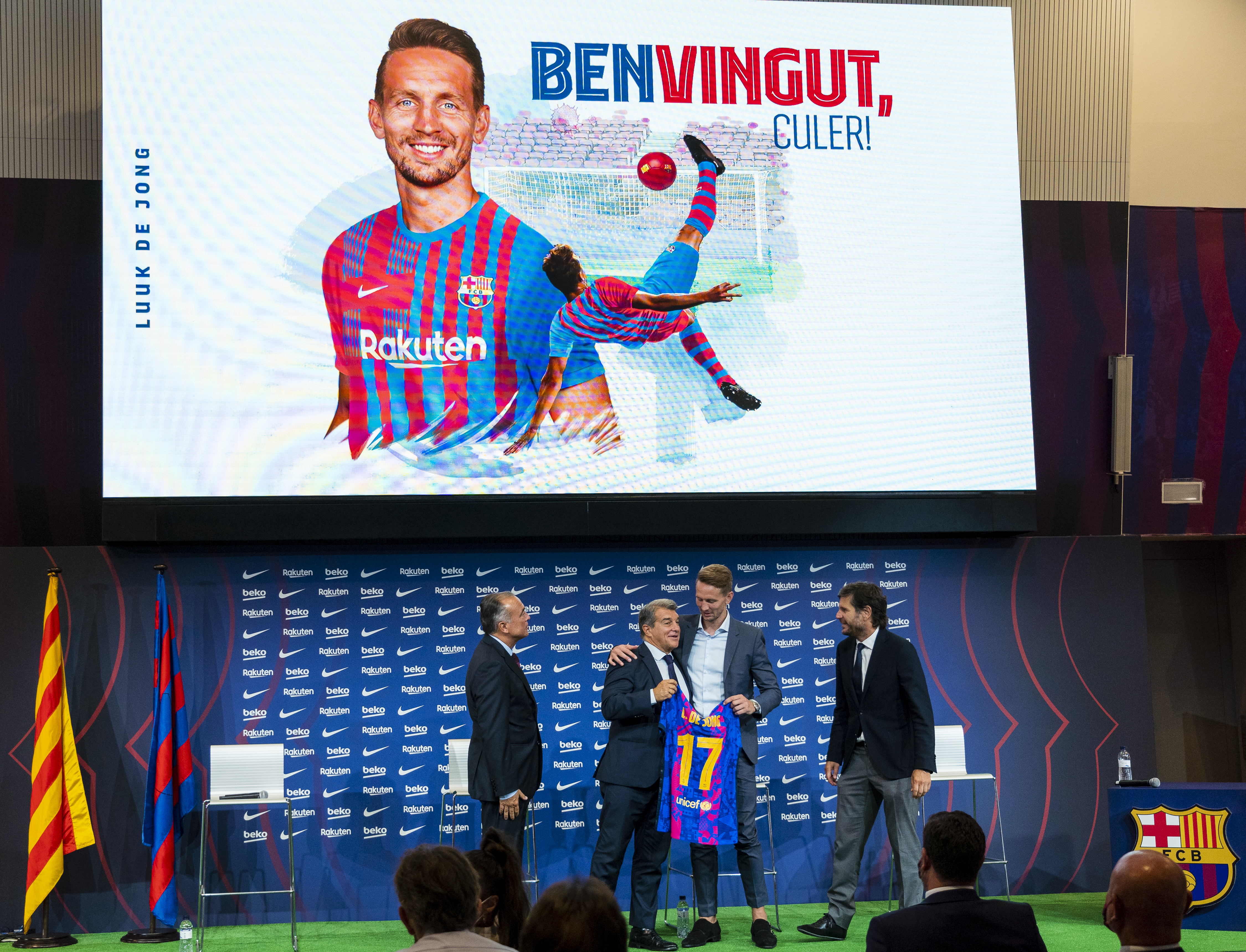 当日,西甲巴塞罗那队举行新闻发布会,从塞维利亚队租借来的荷兰球员卢克·德容正式亮相诺坎普球场。