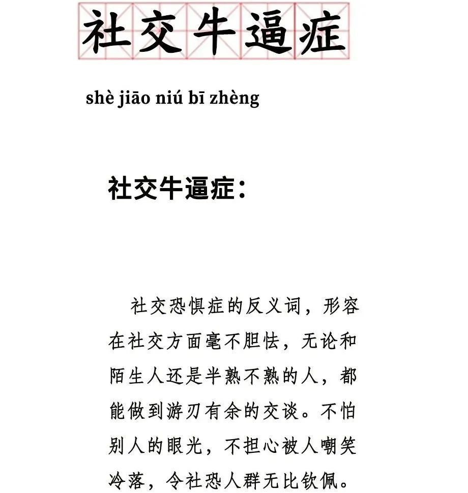 网络新词千千万,“社交NB症”又是啥?简而言之,“社交NB症”特指人在公共场合下面对不熟悉的人和事,不考虑他人的眼光,完全放飞自我。这类人在社交中不怕尴尬,不怕被冷落,体现一种“只要我不尴尬,尴尬的就是别人”的自我价值。