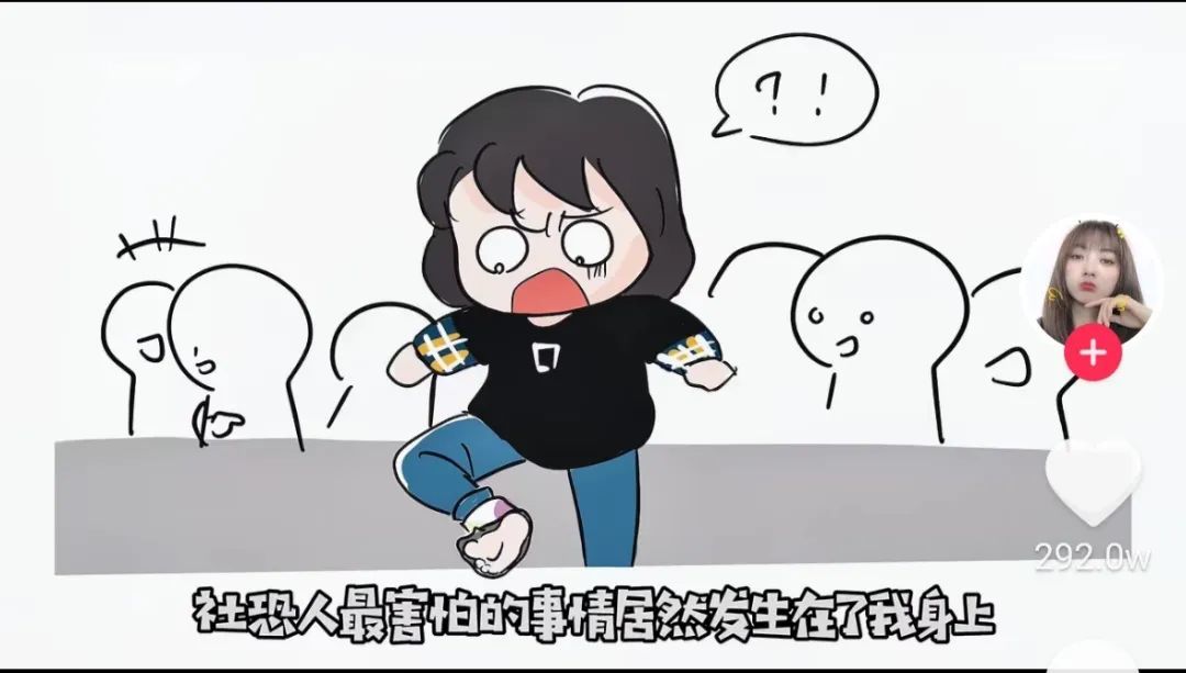 她的视频经常以社恐人无限出糗的内容展开,将一幕幕“社会性死亡”名场面结合在一条视频里,并搭配上动漫的画风和丧气的配音,多重表现引发观众的共鸣。