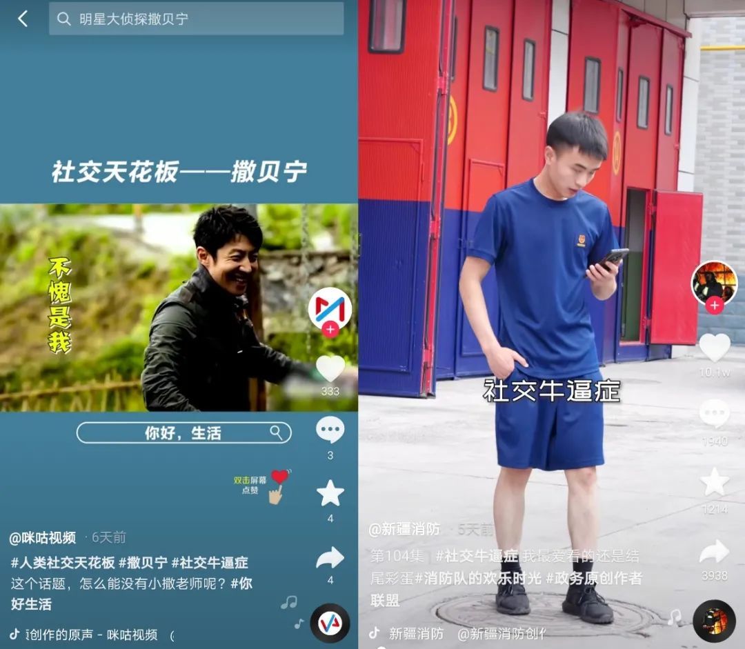 除了网红短视频博主和网友外,娱乐自媒体和官方媒体的加入也让这个话题的热度持续攀升。“能说会道”撒贝宁在节目中的表现被剪辑成片,各种名场面让网友啧啧称赞“没有人能管得了撒贝宁”“社交NB症典型代表”。连@新疆消防 都跟上热度自制剧情,搞笑演绎“社交NB症”的瞬间。