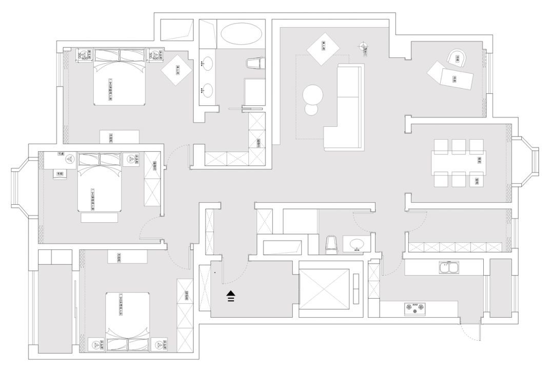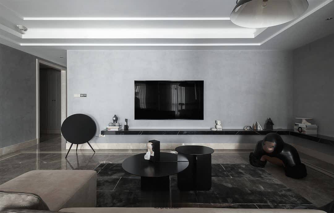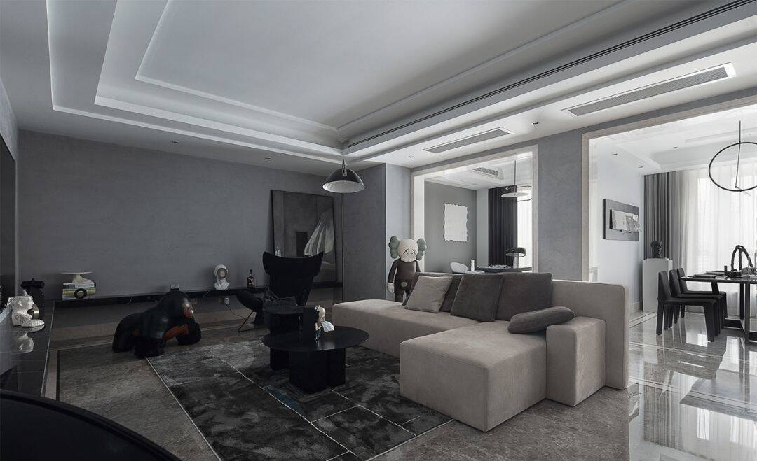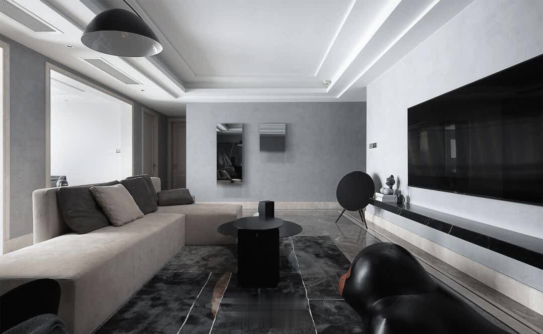 ▲现代简约风格的空间,深灰色的地面+浅灰色墙面空间,天花以叠级吊顶造型,整个空间都显得充满现代舒适而大气。