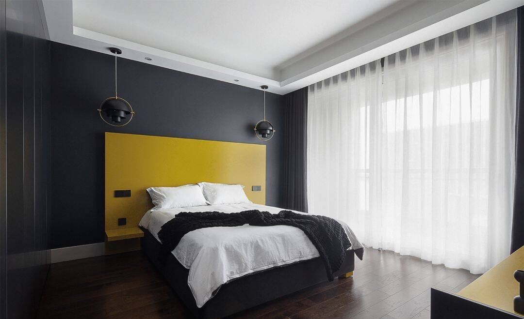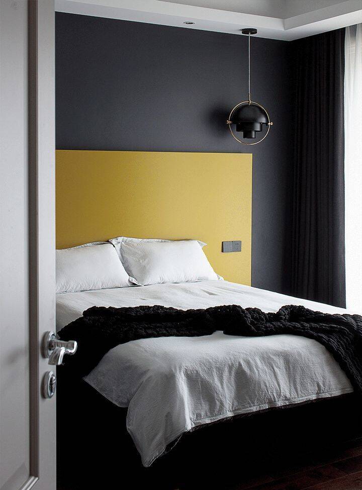 ▲黑色背景墙+黄色定制的床头墙,布置深灰色床铺与雅白的床单,带来一种稳重而又跳跃时尚的卧室空间感。