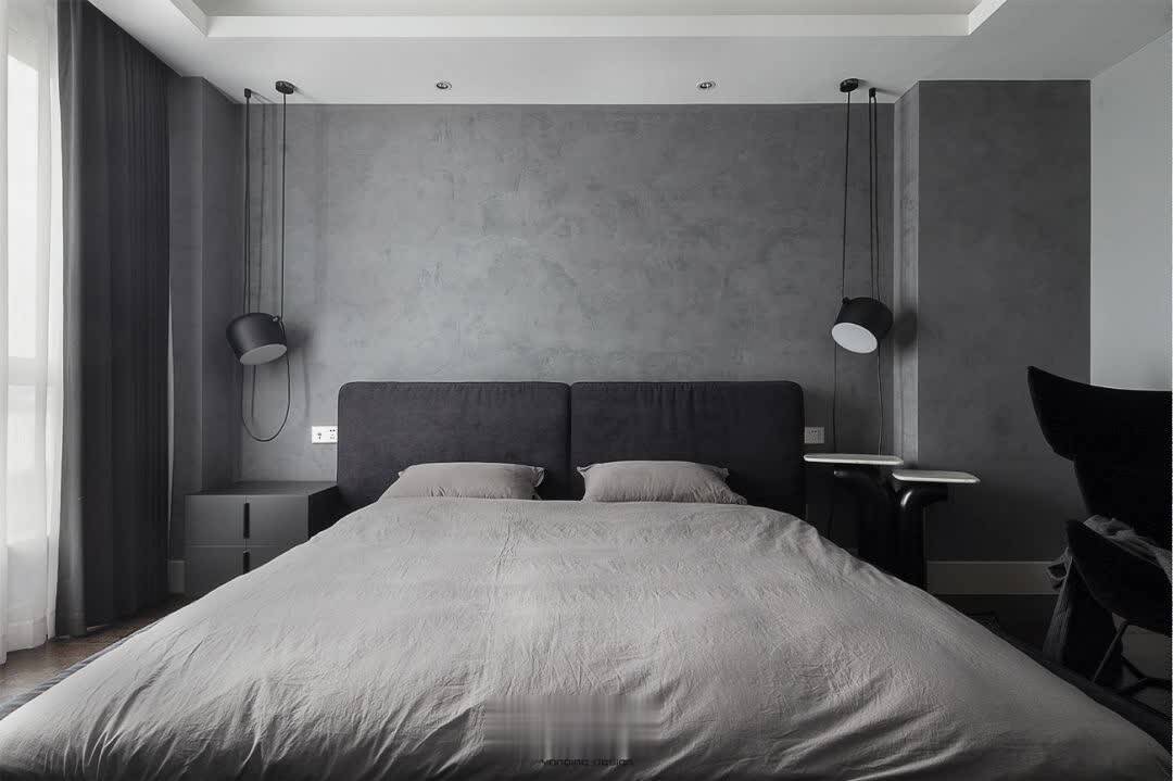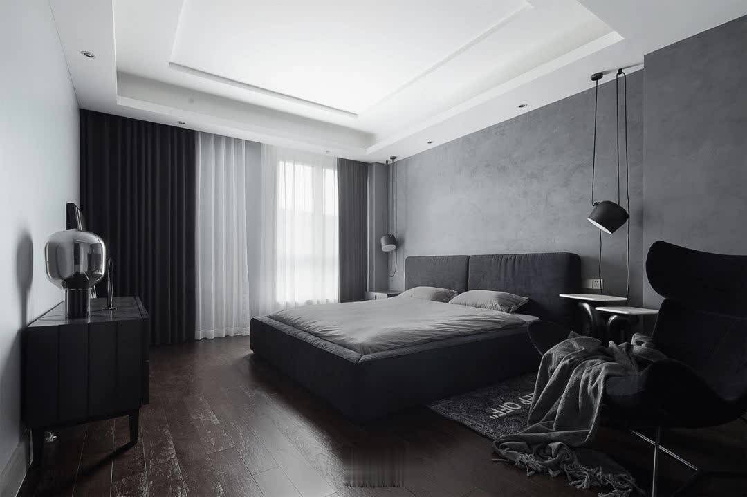 ▲卧室床头墙也是灰色的墙面基础,装上深木色木地板,布置灰色布艺床与床单,旁边黑色的休闲椅、斗柜布置,黑白配的窗帘与纱帘组合,让卧室显得安静端庄而舒适大方。
