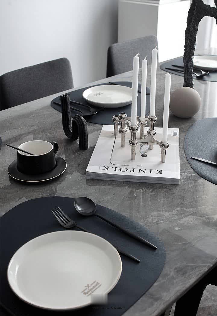 ▲黑色脚架+石材台面的餐桌,布置黑白配的餐具与烛台装饰,营造出一种时尚端庄的用餐仪式感。