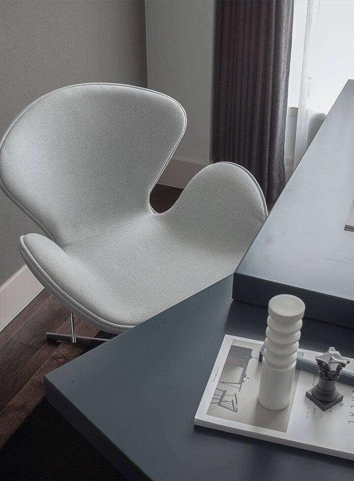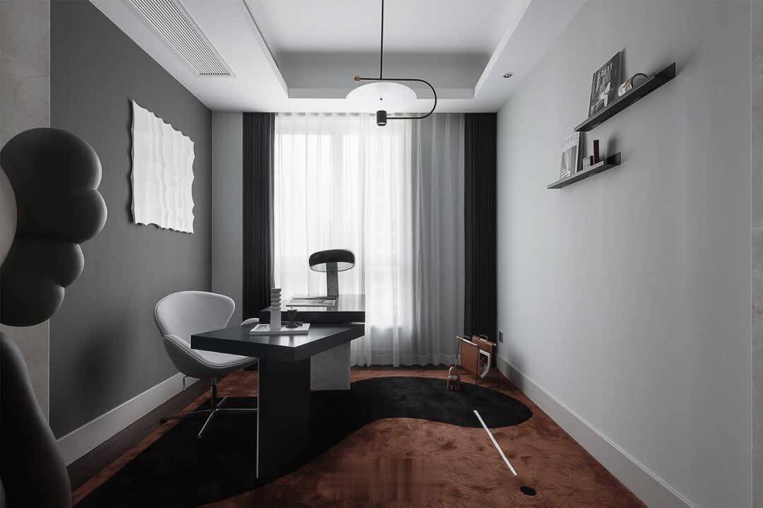 ▲书房以灰色的墙面空间,居中位置布置一张成品书桌,加入弧形地毯装饰,也营造出了一个安静舒适的工作加班或阅读的空间。
