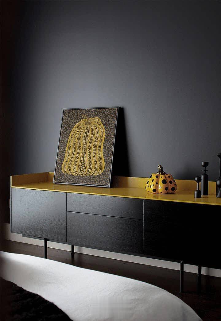 ▲床尾墙在黑色墙面基础,布置一个黑色斗柜,柜子台面加入黄色的设计,摆上黄色的的装饰画与小南瓜摆饰品,也让空间显得更加活泼有趣。