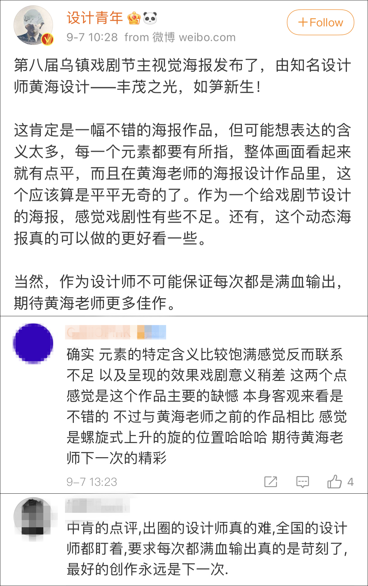 盛赞之下,不乏质疑声。有网友认为,这与黄海以往的设计相比,并不算惊人之作,作为给戏剧节设计的海报,戏剧主题凸显不足,放在其他艺术节上使用也不违和。不过,网友提出,要求设计师每次都“满血输出”也过为苛刻。