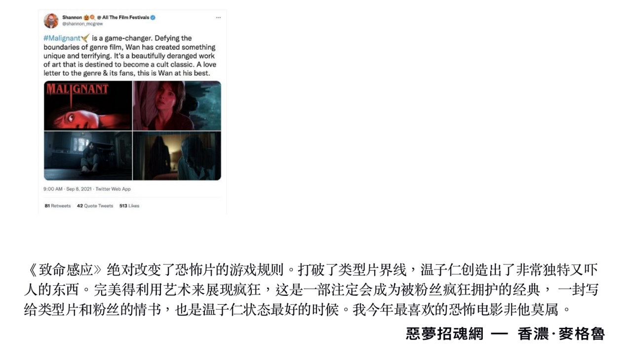 大师级别的温子仁,在《致命感应》上实现了裂变,霸王级的惊悚氛围,与 B 级片浓厚的血浆味,以及 1977 年的阴风阵阵的致敬,有血浆、有反转、有悬疑侦查、有恐怖,温子仁把他所有拿手绝活都混在此,是类型的混搭极致,也是恐怖片加爽片的极致,也是近几年来最有新鲜感的恐怖电影。