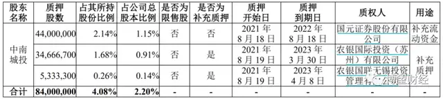但另一方面,8月21日中南建设发布关于控股股东持股质押情况公告称,中南城建将所持中南建设8400万股股份质押,占其所持股份的4.08%、中南建设总股本的2.2%,最早质押到期日为20221年8月,质权人分别为国元证券股份有限公司、农银国际投资(苏州)有限公司和农银国联无锡投资管理有限公司,用于补充流动性资金以及补充质押。