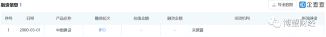据企查查官网显示,中南建设自成立以来仅存有1条IPO融资信息。具体如下: