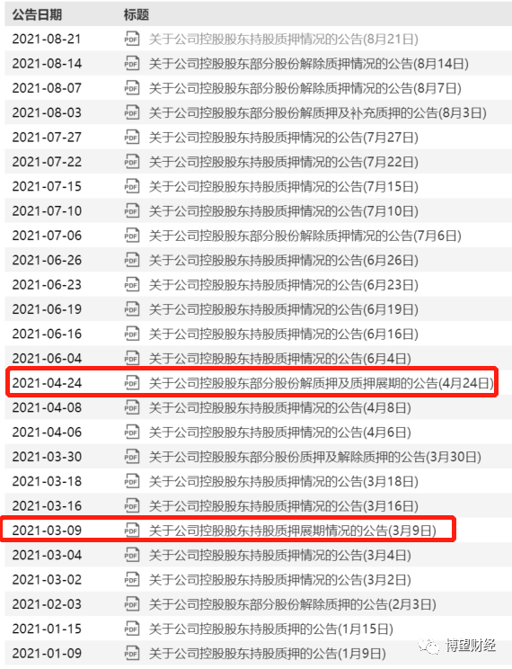要知道,2021年以来中南建设发布关于控股股东持股质押情况公告已超20则,其中2则包括4月24日及3月9日的质押展期公告,足可见控股股东中南城建流动性压力颇大。