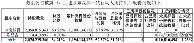 截至上述公告披露日,中南城建及其一致行动人陈昱含合计持有中南建设20.74亿股股份,持股比例合计54.21%,累计质押股份11.94亿股,占合计所持股份的57.57%、中南建设总股本的31.21%。其中未来半年内到期的质押股份数量为2.41亿股,对应融资余额6.15亿元;未来一年内到期的质押股份数量为3.95亿股,对应融资余额11.22亿元。