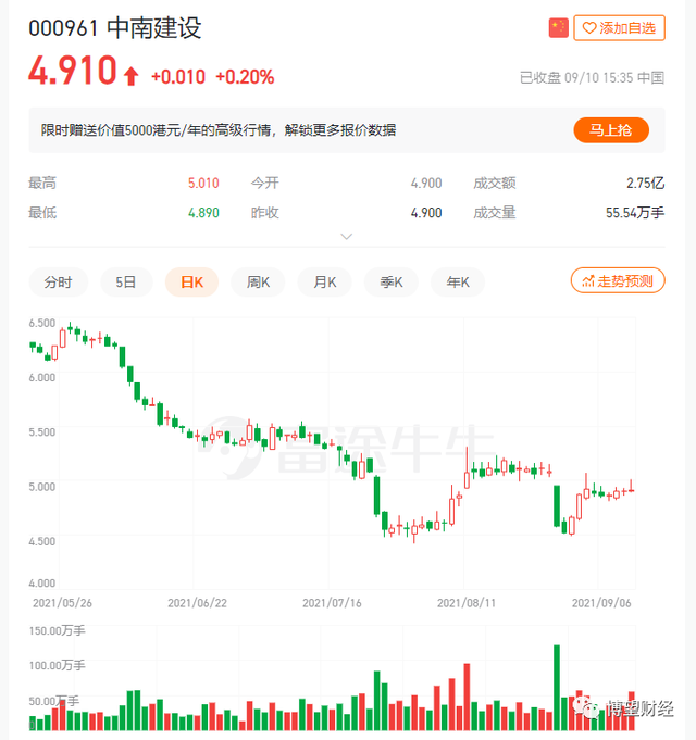 受半年报业绩影响,8月27日中南建设股价低开低走,盘中触及跌停,收盘于4.58元,跌幅为9.84%,市值一日“蒸发”19亿元。此外,从整体趋势来看,中南建设股价也是每况愈下,由2020年11月30日最高价9.45元/股波动暴跌下滑至2021年8月2日最低价4.42元/股,此后上演“过山车”,截至9月10日收盘价4.91元/股,暴跌超50%。